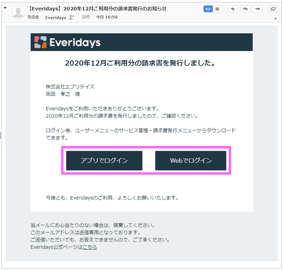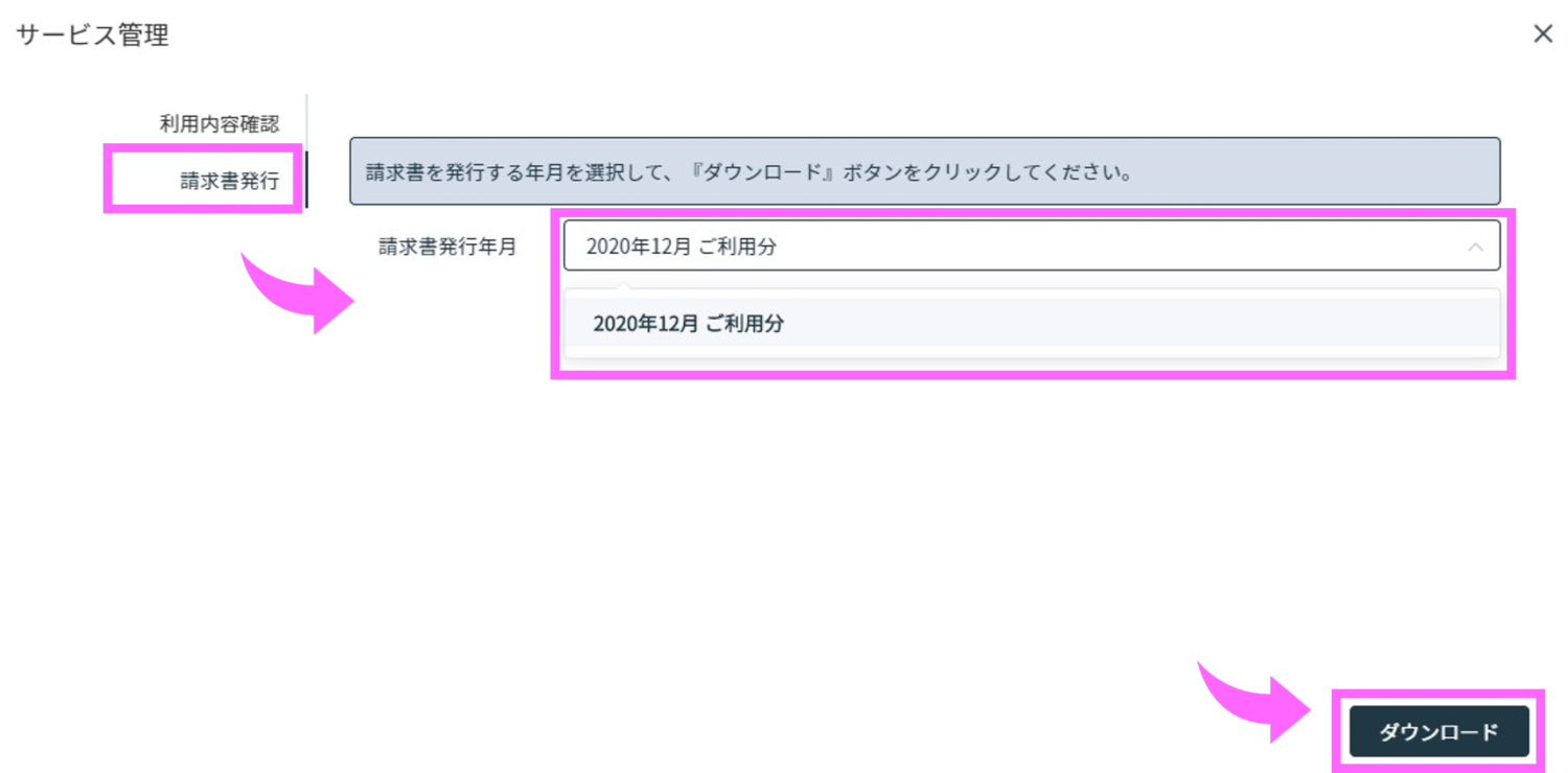 情報タイトル請求書の確認方法についてURL 名1579記事質問請求書の確認方法について回答Everidays(エブリデイズ)のご利用請求書の確認方法について記載しております。 目次 1.請求書の確認方法(クレジットカードでお支払いのお客さま)2.請求書の確認方法(口座振替(Paid)でお支払いのお客さま) 1.請求書の確認方法(クレジットカードご利用のお客さま) (1) 毎月7日までに、先月分の請求書としてメール(件名:【Everidays】YYYY年MM月ご利用分の請求書発行の お知らせ)が、組織代表者宛に届きます。 (2) Everidaysにログイン後、右上のアカウントメニューより、「利用プラン/支払管理」を選択します。 (3) 「請求書発行」を選択し、「請求書発行年月」から確認したい請求書を選択します。 「請求書発行年月」を選択後、「ダウンロード」ボタンをクリックします。 (4) 指定したフォルダに請求書がダウンロードされます。 2.請求書の確認方法(Paidでお支払いのお客さま) (1) 毎月第3営業日ごろに、Paid(運営:株式会社ラクーンフィナンシャル)から、Paidご契約時に ご登録いただいたご担当者様宛に、先月分の請求書のご案内メールが送付されます。 毎月第3営業日からは、Paidのご利用明細ご確認サイトで請求情報がを確認することが可能になります。 また、毎月第4営業日以降、請求書が送付されます。 詳細は、 Paid にご確認ください。